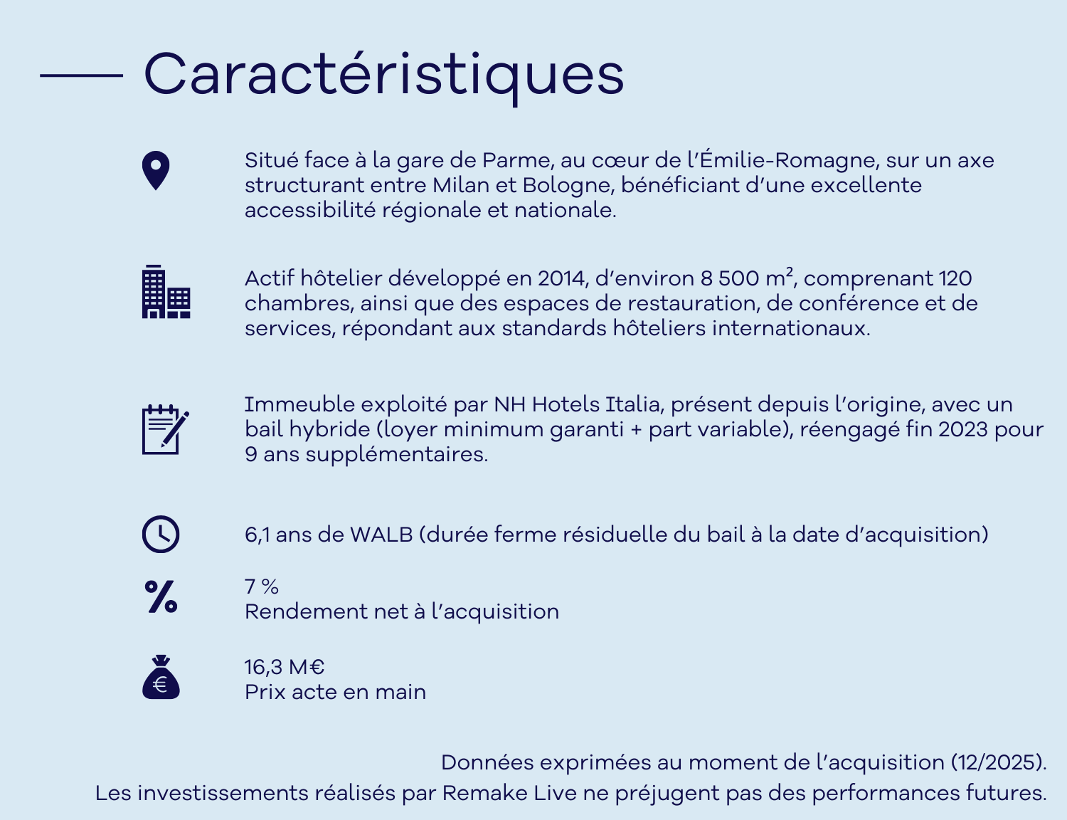 L’immeuble, développé en 2014 et situé face à la gare de Parme, développe environ 8 500 m² et comprend 120 chambres, ainsi que des espaces de services et de conférences, au sein d’une région à forte attractivité économique et touristique.
