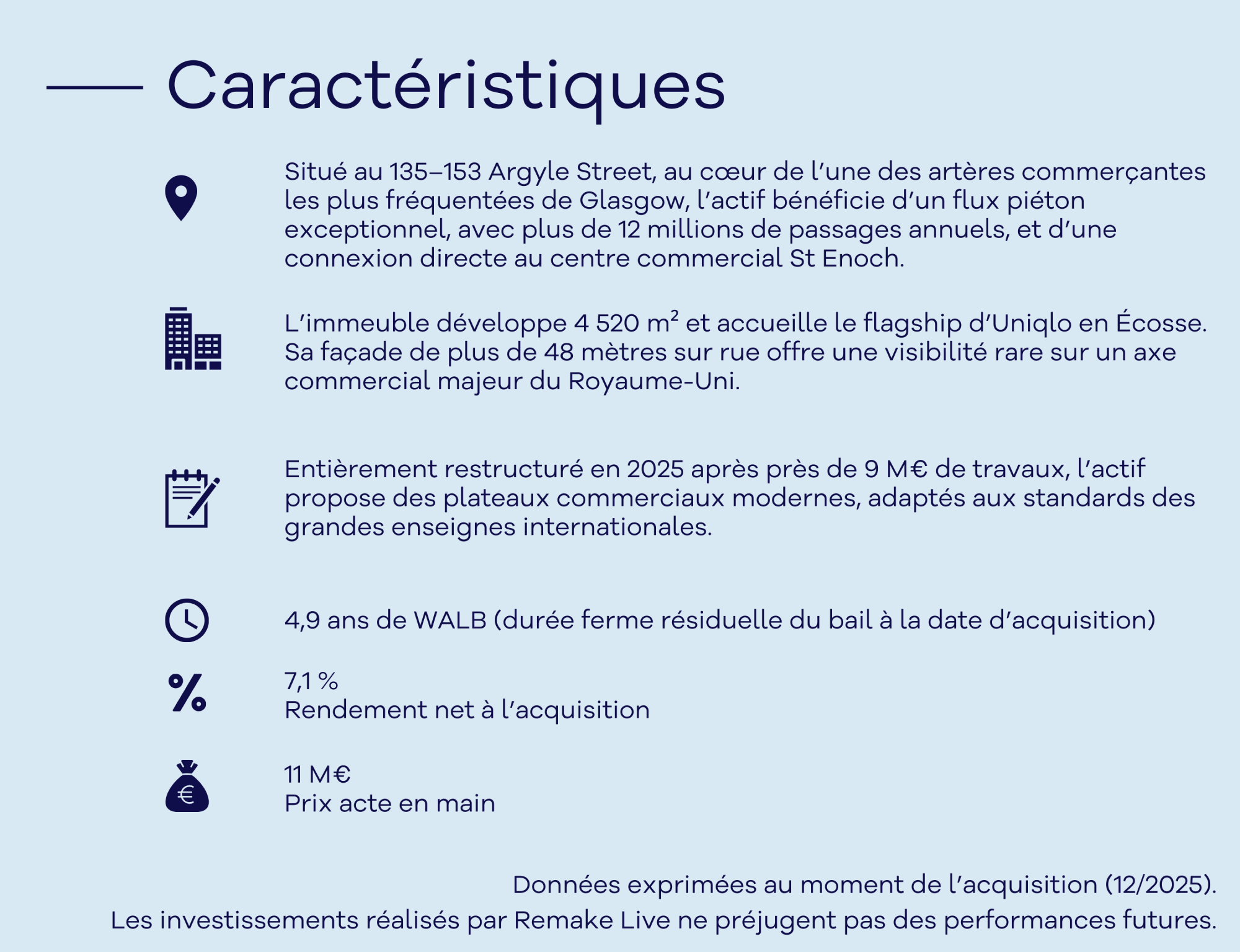 • Une occupation sécurisée par Uniqlo, qui y exploite son flagship en Écosse, avec un bail ferme et un potentiel de création de valeur sur les étages supérieurs aujourd’hui non valorisés