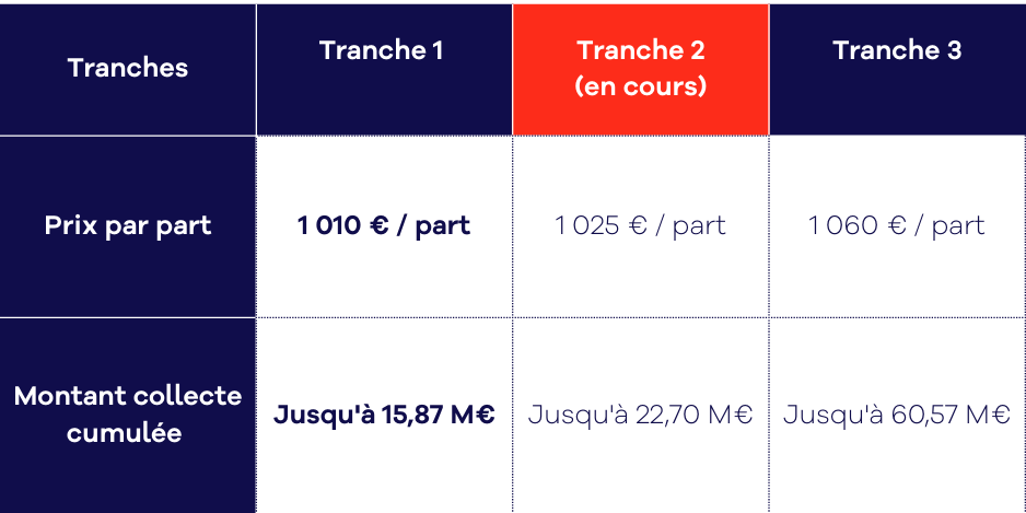 Le passage à la tranche suivante s'effectue automatiquement dès que le montant de collecte est atteint. Il n'y a pas de date fixe : une fois la limite franchie, le nouveau tarif s'applique à toutes les nouvelles souscriptions.